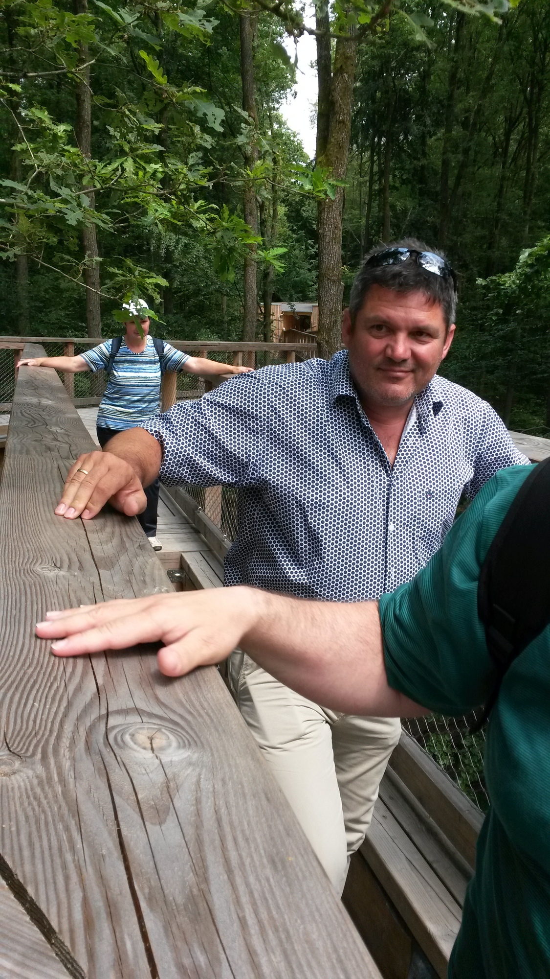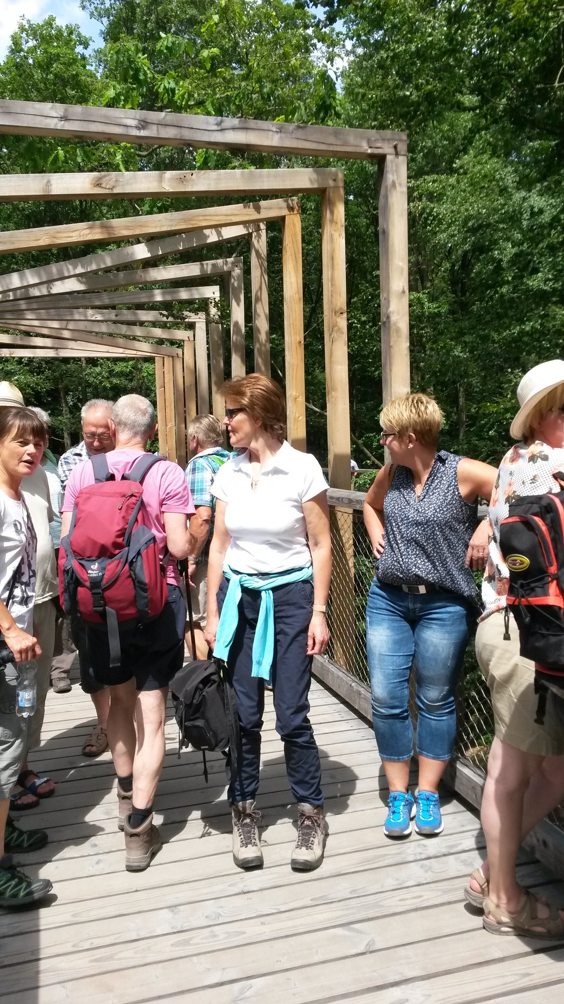 Wieder auf dem (Wald-) Boden angekommen, ging es über einen Verbindungspfad 3,2 km durch den schattigen Laubwald zum Steigerwald-Zentrum am Ortsrand des unterfränkischen Handthals. Es ist ein modernes Gebäude, ganz aus dem nachwachsenden Rohstoff Holz, der Buche, gebaut. Damit will man zum einen die Bedeutung der Buche im Steigerwald betonen, zum anderen ein praktisches Beispiel für neue Verwendungsmöglichkeiten von Buchenholz aufzeigen.