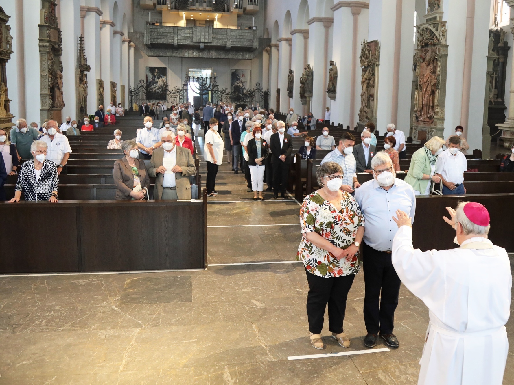 Würzburg (POW) Mit rund 110 Ehepaaren aus dem ganzen Bistum hat Bischof em. Dr. Friedhelm Hofmann am Mittwochvormittag, 23. Juni, einen Pontifikalgottesdienst für Ehejubilare gefeiert, die in den Jahren 2020 und 2021 auf 50, 60 oder 65 gemeinsame Jahre zurückblicken. „Ich danke Ihnen allen für Ihr Zeugnis“, sagte Bischof Hofmann zu den Gläubigen, die den Gottesdienst im Würzburger Kiliansdom unter den aktuellen Corona-Beschränkungen feierten. „Sie zeigen deutlich, dass die Ehe kein Auslaufmodell unserer Gesellschaft, sondern im Gegenteil Grundlage eines prosperierenden Gemeinwohls ist. Ehe hat Zukunft!“ Im vergangenen Jahr mussten die Gottesdienste für die Ehejubilare aufgrund der Coronapandemie entfallen. Deshalb werden in diesem Jahr insgesamt 18 Gottesdienste für Ehejubilare gefeiert, die in den Jahren 2020 und 2021 ihr silbernes beziehungsweise goldenes, diamantenes oder eisernes Ehejubiläum begehen. Trotz der Coronakrise seien die Menschen in der Kirche beheimatet und erführen Gottes Liebe, erklärte Bischof Hofmann.