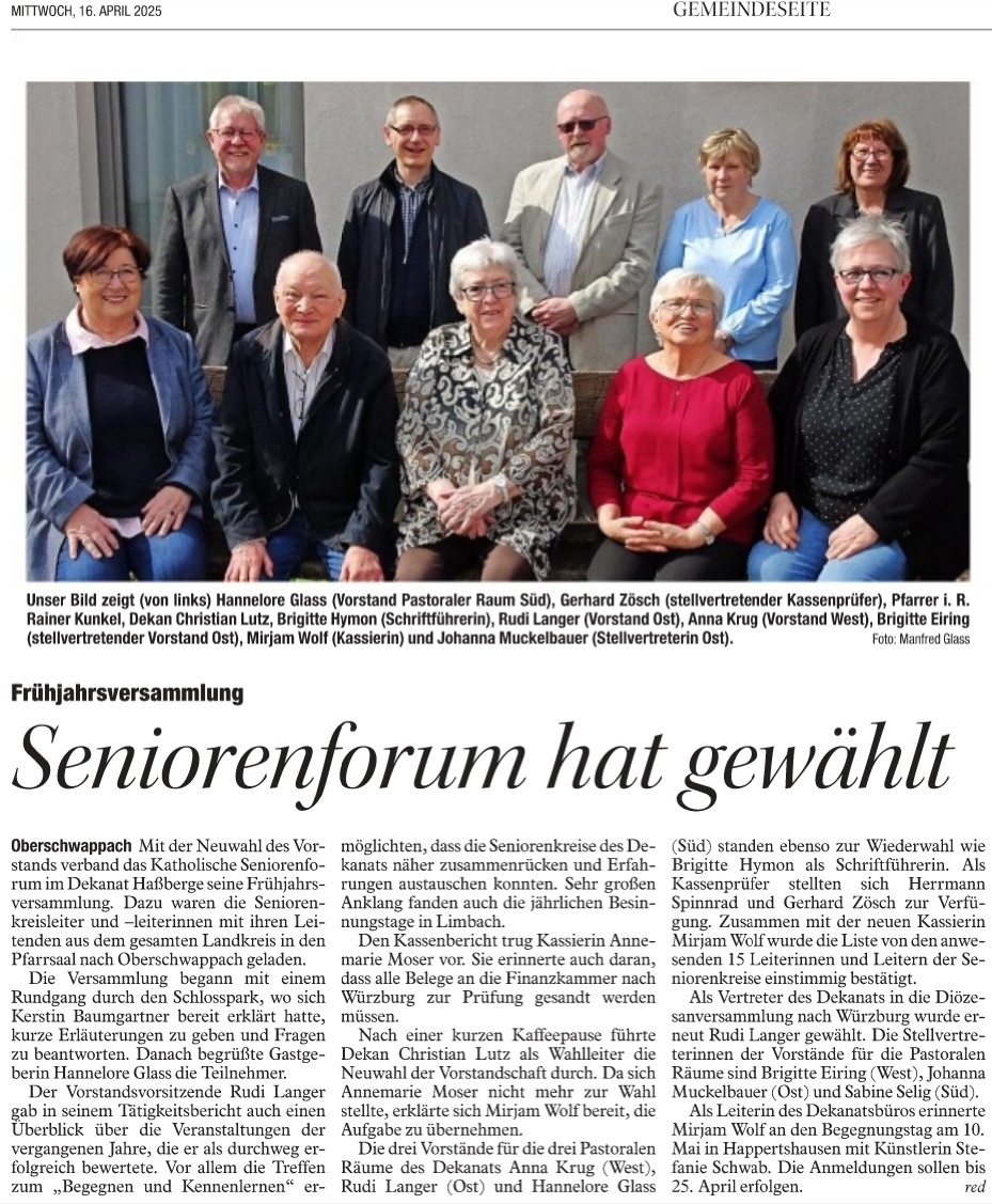 Als Vertreter des Dekanats in die Diözesanversammlung nach Würzburg wurde erneut Rudi Langer gewählt. Die Stellvertreterinnen der Vorstände für die Pastoralen Räume sind Brigitte Eiring (West), Johanna Muckelbauer (Ost) und Sabine Selig (Süd).