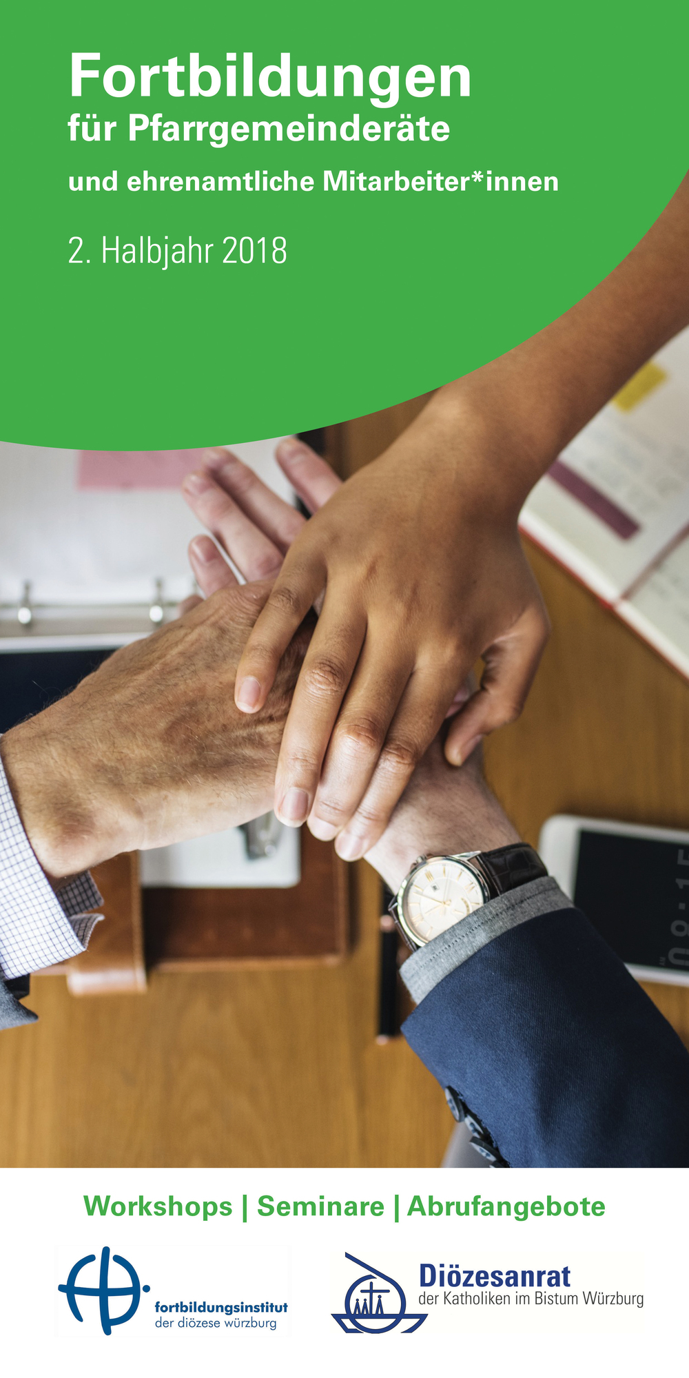 Es wird herausgegeben vom Diözesanrat der Katholiken im Bistum Würzburg und dem Fortbildungsinstitut (fbi) der Diözese. „Mit unseren Fortbildungen möchten wir Sie dabei unterstützen, Ihr Engagement fachlich oder spirituell zu vertiefen“, schreiben Florian Liebler vom Diözesanrat und Stefan Heining vom Fortbildungsinstitut des Bistums Würzburg im Vorwort. Interkulturelle Fortbildungen zum Thema Muslime und Christen sind genauso darin enthalten wie spirituelle Angebote, Leitungskurse und Coachings für Vorsitzende von Pfarrgemeinderäten. Es finden sich darüber hinaus auch biblische Veranstaltungen zur neuen Einheitsübersetzung der Bibel oder ein Eselpilgertag im Tagungszentrum Schmerlenbach. Nähere Informationen gibt es bei Fortbildungsreferent Stefan Heining, E-Mail stefan.heining@bistum-wuerzburg.de. Interessierte können die Broschüre kostenfrei per E-Mail an fbi@bistum-wuerzburg.de anfordern. Zum Download steht die Datei unter www.pgr.bistum-wuerzburg.de im Internet bereit. Auch ist eine neue Mappe mit dem Titel „Ideen und Materialien für Pfarrgemeinderäte, Initiativen, Gruppen, Verbände“ erschienen. Ehren- und hauptamtlich Engagierte können ebenfalls unter www.pgr.bistum-wuerzburg.de die Mappe downloaden oder ein kostenfreies Exemplar bestellen.