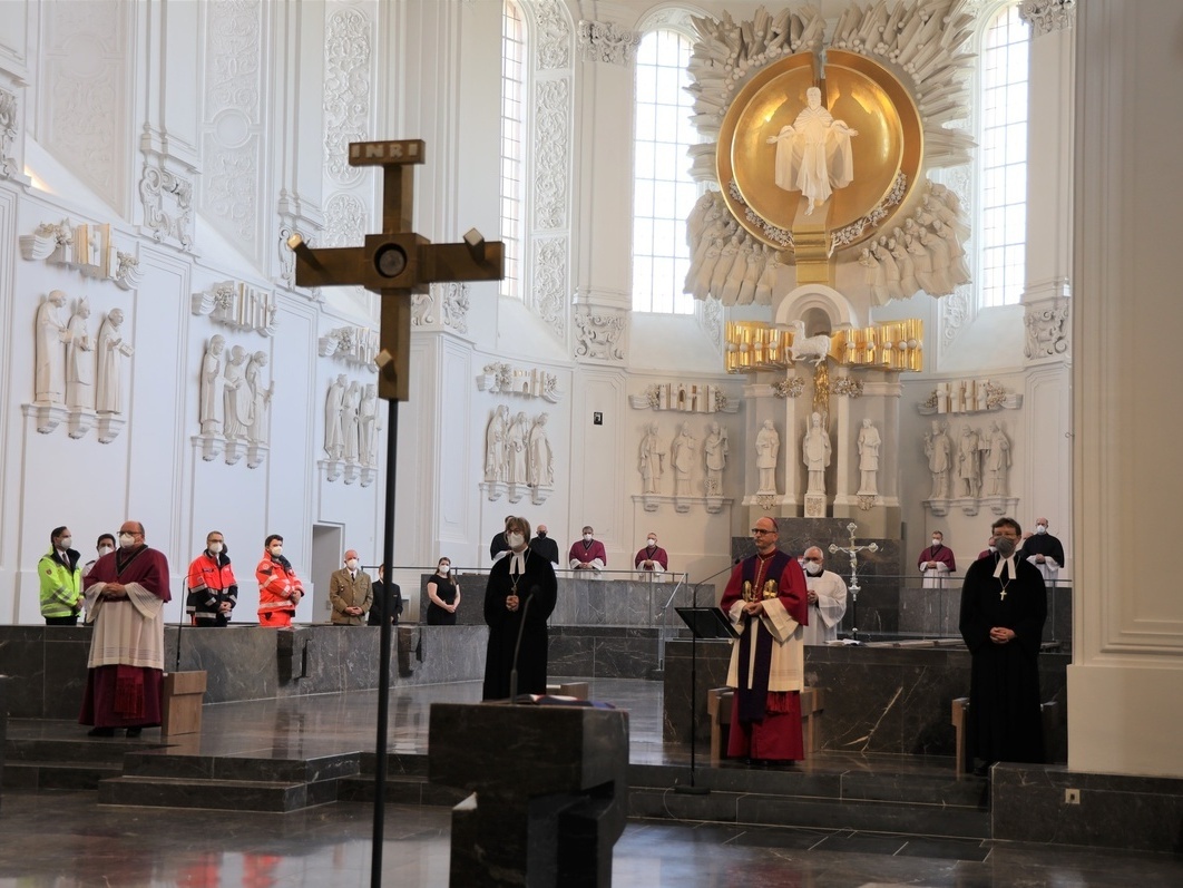 Der Prophet Jeremia fasse sich nach all seiner Trauer, entkräftet vom Klagen, noch ein Herz, hob der Bischof hervor. Er richte sich an der Gewissheit auf, dass Gott die heilige Stadt Jerusalem nicht aufgebe. „Es ist die Stadt, in der Gewalt nicht mit Gewalt beantwortet wird. Die Stadt, in der Angst nicht in Aggression umschlägt. Die Stadt, in der Verzweiflung nicht in Hass mündet. Die Stadt, in der Verletzung nicht neue Verletzung gebiert.“ Bischof Jung ermunterte dazu, schweigend auf die Hilfe Gottes zu harren. „Schweigend, weil uns Worte fehlen angesichts der Dimensionen dessen, was da mitten unter uns geschehen ist. Schweigend, weil das Erlebte Raum braucht, um im Prozess der Trauer verarbeitet werden zu können. Schweigend, weil unsere Anteilnahme keine Worte verträgt, aber auch keine Worte braucht, wenn liebende Gegenwart uns in dieser Stunde erfüllt.“ Der Bischof dankte Polizei und Rettungskräften für ihren aufopferungsvollen Einsatz und bat Gott um Frieden und Versöhnung angesichts der erfahrenen Schrecken. „Denn nur so wird nach den Tagen der Trauer ein Neuanfang möglich werden, über dem der Segen Gottes liegt.“